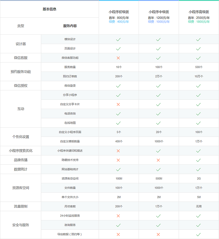 根據(jù)功能不同,我公司小程序有三個(gè)版本,價(jià)格分別為:800元(續(xù)費(fèi)400元),1200元(續(xù)費(fèi)1000元),2500元(續(xù)費(fèi)1800元),以上價(jià)格為已有認(rèn)證微信公眾號(hào)的報(bào)價(jià),如需代理開通微信公眾號(hào)首年另加500元 詳細(xì)功能介紹 >>