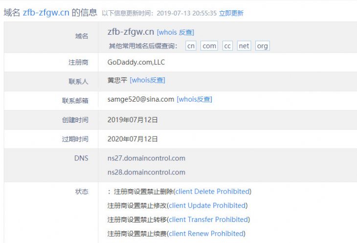 1、大多數(shù)人訪問網(wǎng)站沒有注意網(wǎng)址的習(xí)慣,這個網(wǎng)站的域名(www.zfb-zfgw.cn)并不是支付寶或者的官方(alipay.com)域名,這也是博川一眼就認定這是虛假網(wǎng)站的原因。查詢域名注冊信息之后發(fā)現(xiàn),果然,這是一個昨天(7月12日)才剛剛注冊的新域名,正常來說一個正規(guī)網(wǎng)站涉及到開發(fā)、備案、上線測試等多個流程,是不可能注冊后就立即使用的。而且,域名的注冊人為個人,所使用的注冊郵箱也是一個個人新浪郵箱號。像支付寶這樣的公司,是不可能采用這樣不正式的注冊形式的。